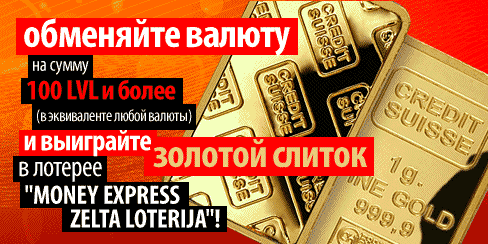 Обменяйте валюту на сумму 100 LVL и более (в эквиваленте любой валюты) и выиграйте золотой слиток в лотерее "MONEY EXPRESS ZELTA LOTERIJA"!